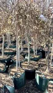 For those inclined towards do-it-yourself projects, bagged or container trees are often the preferred choice due to their ease of transportation. At our nursery, we cultivate trees in both bags and containers. While container growth is minimized to prevent the tree from outgrowing its current pot and necessitating frequent replanting, we favor the use of grow bags as an effective above-ground cultivation method. The utilization of grow bags promotes the development of a fibrous root system, essential for the tree’s successful integration into your garden. This method fosters an environment conducive to root growth, discouraging circling or girdling. The fibrous roots are optimized for efficient nutrient and water absorption. The stable, flat base of the bags facilitates the growth of straight trees, with many featuring handles for ease of handling.